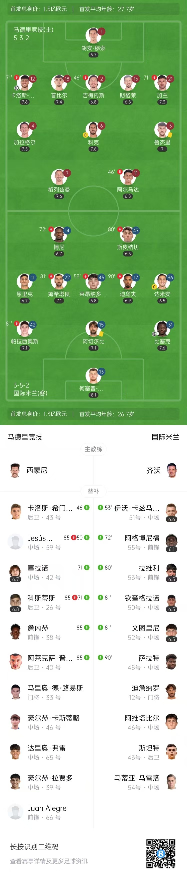 全场比赛结束,马德里竞技5-3击败国际米兰。