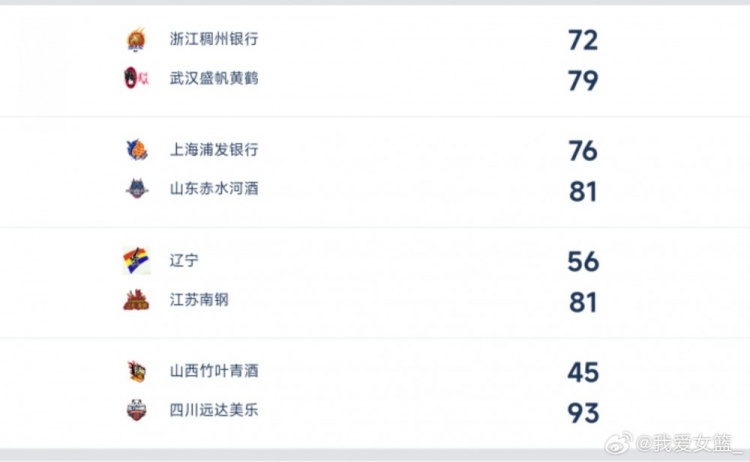 上海浦发银行76-81山东赤水河酒,山东队赵雅琢18分,张婧16分,周静14分,邹广凤13分7篮板,隋文萍10分。上海队刘禹彤16分8篮板,王樱霓12分6篮板,黄靖12分5篮板,伍湘琳10分,刘露10分8篮板。