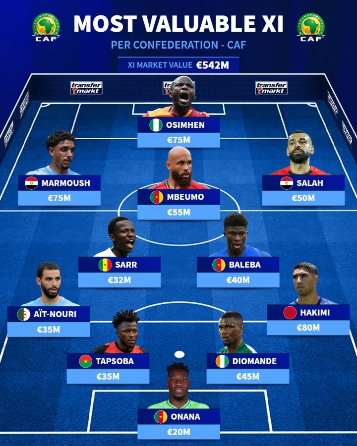 总身价5.42亿欧!非洲足联最贵阵:阿什拉夫、萨拉赫、奥纳纳在列