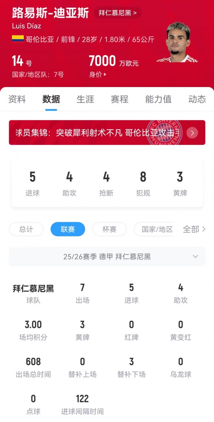 而夏窗总价7500万欧元离开利物浦,加盟拜仁的迪亚斯在更换环境后,仍保持着火热的状态。他目前为拜仁在德甲出战7场比赛,贡献5球4助,共直接参与球队9个进球。除了进攻端的表现,迪亚斯防守时的积极性也得到了拜仁球迷的好评。