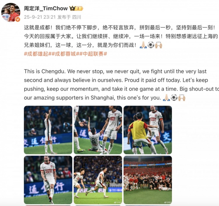 9月21日讯 帮助蓉城绝平申花后,周定洋更新社媒,庆祝这场重要的平局。周定洋第99分钟读秒绝平,门前补射破门,帮助蓉城客场1-1战平申花,继续占据争冠的主动权。赛后,周定洋在社媒晒照并配文写道:这就是成都!我们绝不停下脚步,绝不轻言放弃,拼到最后一秒,坚持到最后一刻!今天的回报属于大家。让我们继续拼、继续冲,一场一场来!特别想感谢远征上海的兄弟姐妹们,这一球,这一分,就是为你们而战!⚽️